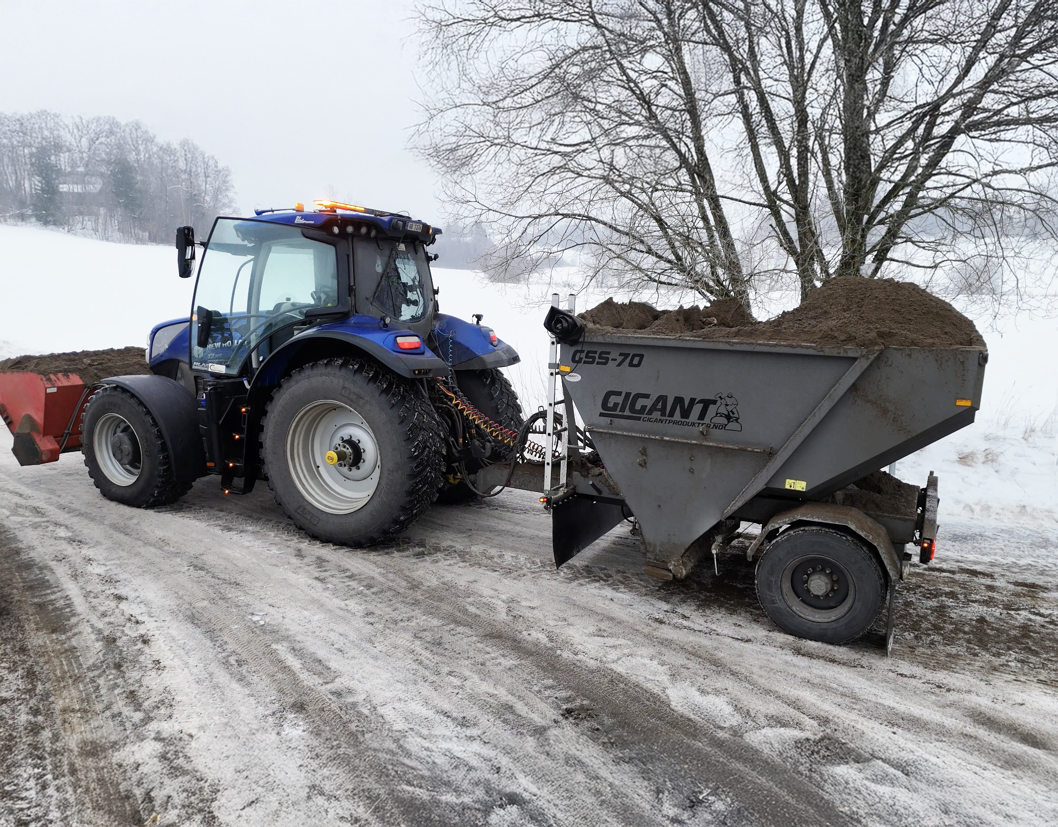 Det betyr at logistikken må sitte: riktig mengde sand, driftssikkert utstyr og løsninger som fungerer i praksis når temperaturen veksler og sanden oppfører seg … som sand gjør. Nå har han den store Gigant GSS-100 bak traktoren, og skal bruke den ut denne vinteren. Strøvogna har en egenvekt på 4,5 tonn, nyttelast på 15,5 tonn og totalvekt på 21 tonn.