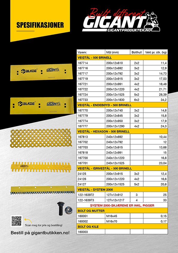 Vi har et bredt utvalg av slitestål i høy kvalitet, inkludert forskjellige typer tilbehør, perfekt for både profesjonelle og private brukere. Vi har slitestål i lengder fra 610 mm til 1.830 mm, med en tykkelse på 12 mm.